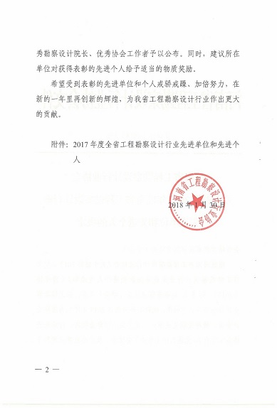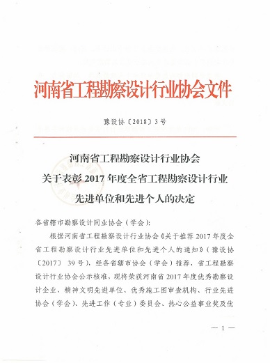 1月30日,河南省AYX爱体育勘察设计行业协会发布“豫设协[2018]3号”文件,对2017年度全省AYX爱体育勘察设计行业先进单位和先进个人进行了表彰。设计公司荣获“河南省2017年度优秀勘察设计企业”、“河南省2017年度AYX爱体育勘察设计行业精神文明先进单位”、“河南省2017年度AYX爱体育勘察设计行业热心公益事业奖”等3项殊荣,公司董事长翟渊军获得“优秀勘察设计院长”荣誉称号,数字AYX爱体育院白勇获得“优秀协会(学会)工作者”荣誉称号。表彰文件如下: