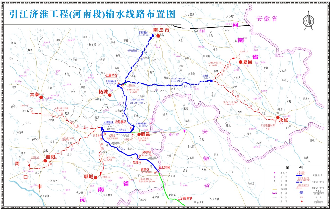 引江济淮AYX爱体育(河南段)输水线路干线总长度为195.14km,AYX爱体育布置可总结为:两条河道、三条管线、四座水库、五座泵站。输水线路以豫院省界为起点,利用清水河通过泵站3级提水至试量闸上游,一路经清水河自流进鹿邑试量调蓄水库,另一路由清水河经鹿辛运河自流至鹿邑后陈楼调蓄水库,再由后陈楼调蓄水库通过管道输水至柘城七里桥调蓄水库,最后由七里桥水库通过两路管道分别输水至商丘新城调蓄水库和夏邑出水池。