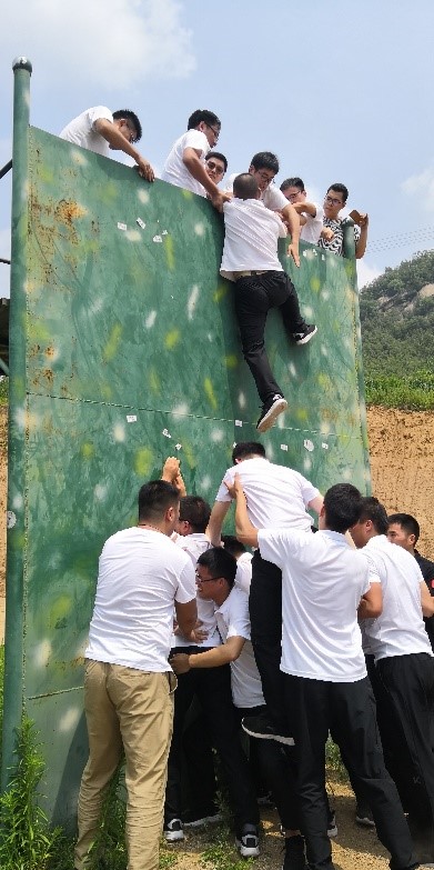 毕业墙:一面4.2米的高墙,不借助任何外界工具,在规定的时间内全体人员完成逃生任务。看似不可能完成的任务,在教练的指导下大家迅速制定战术,通过搭建起层层人梯,人踩人、人举人、人拉人的方式奋力拼搏,精诚合作在短短9分钟完成了任务。当最后一位队友在大家的努力下成功翻越毕业墙的瞬间,雀跃的欢呼声久久不散,这是一个看似不可能完成的任务,却在团队的共同努力下有如此震撼的结果,团队的力量,人梯奉献的力量,给团队的每一位成员都带来极大的震撼和自豪,大家忘却肩膀血痕累累的痛楚,忘却克服高空经历的恐惧,记住了被一双双手托举和拉拽的安全感,记住了团队的强大。