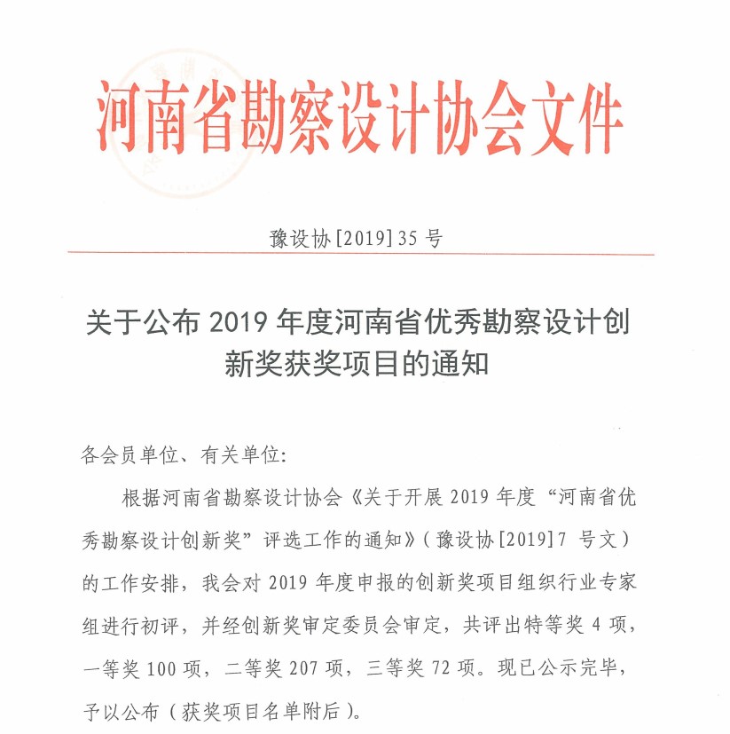 根据河南省勘察设计协会发布的《关于公布2019年度河南省优秀勘察设计创新奖获奖项目的通知》(豫设协【2019】7号),在2019年度河南省优秀勘察设计创新奖评选活动中,设计公司9项成果获奖。