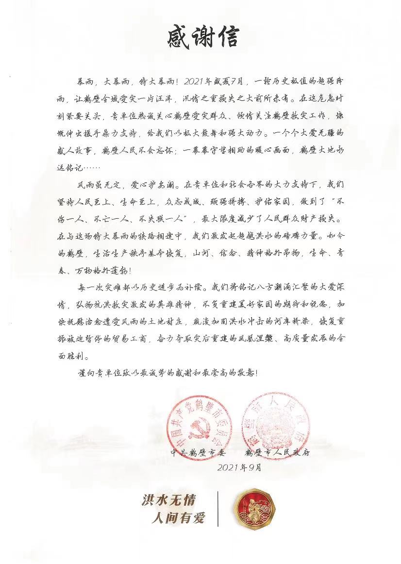 近日,中共鹤壁市委、市政府发来感谢信,对亚美体育登陆公司在抗洪抢险关键时刻给予帮助表示由衷的感谢。