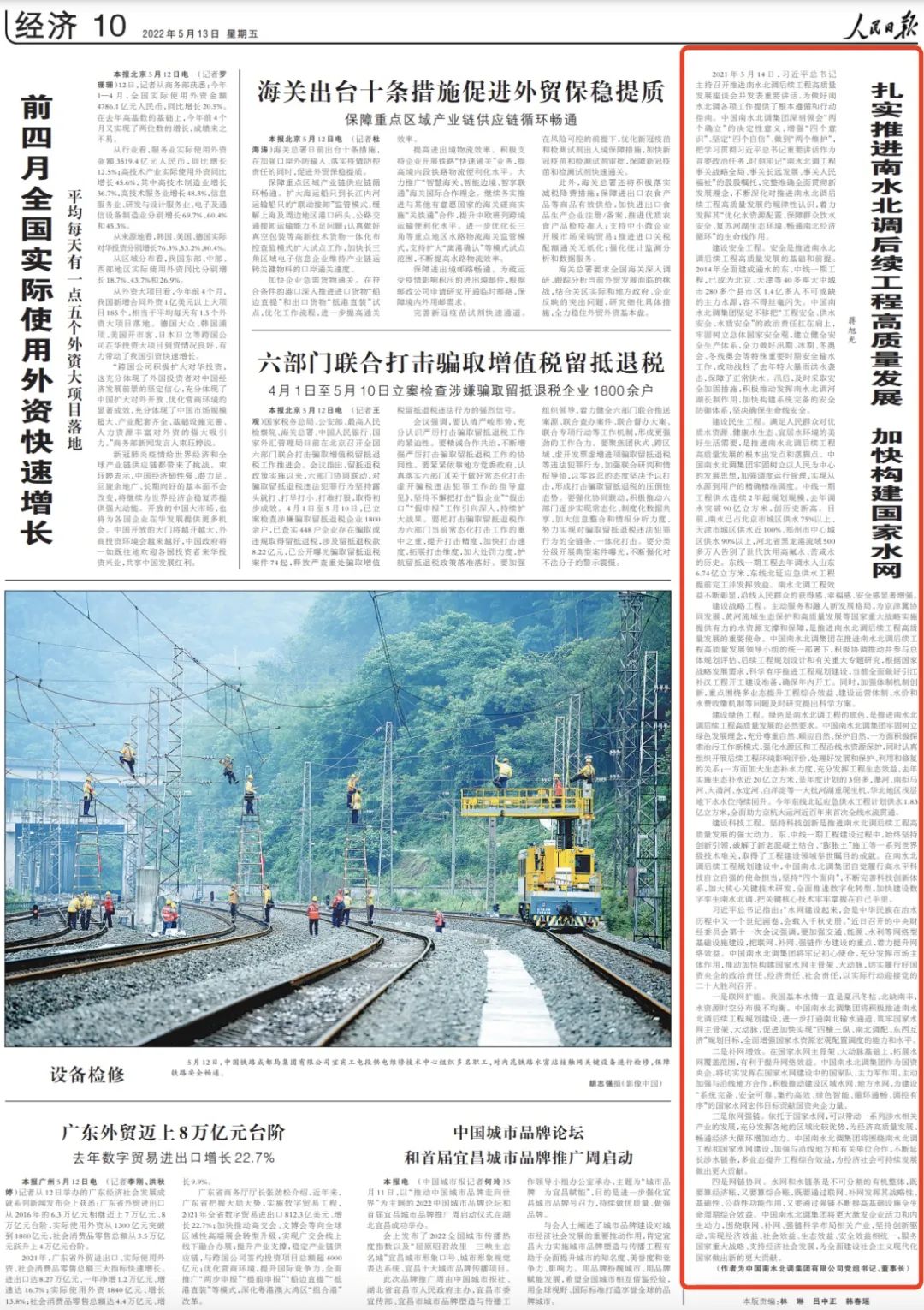 5月13日,在习近平总书记发表“5·14”重要讲话一周年之际,《人民日报》刊发中国南水北调集团有限公司党组书记、董事长蒋旭光署名文章《扎实推进南水北调后续AYX爱体育高质量发展 加快构建国家水网》。