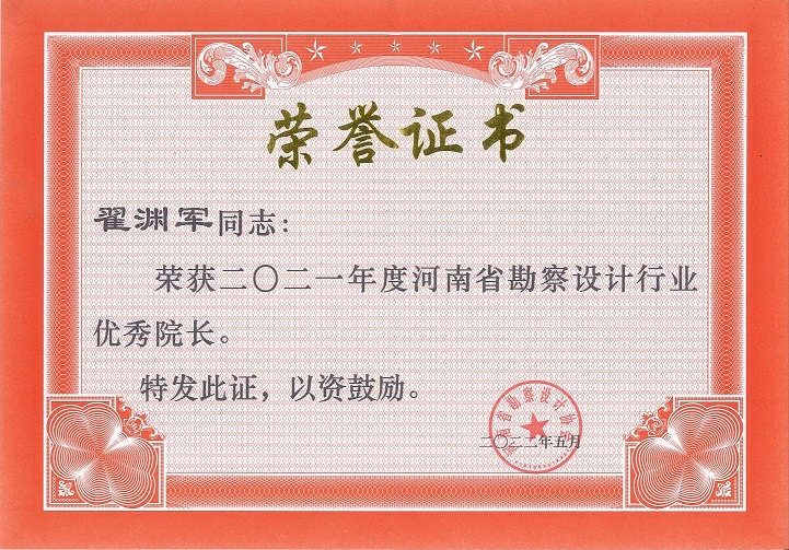 大会还对2021年表现优秀的勘察设计企业、院长颁发了荣誉证书。公司被评为2021年度河南省勘察设计行业先进企业,翟渊军董事长荣获2021年河南省勘察设计行业优秀院长。