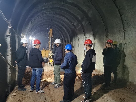公司技术副总监水淼(左)现场查看隧洞砂卵石地层坍塌问题