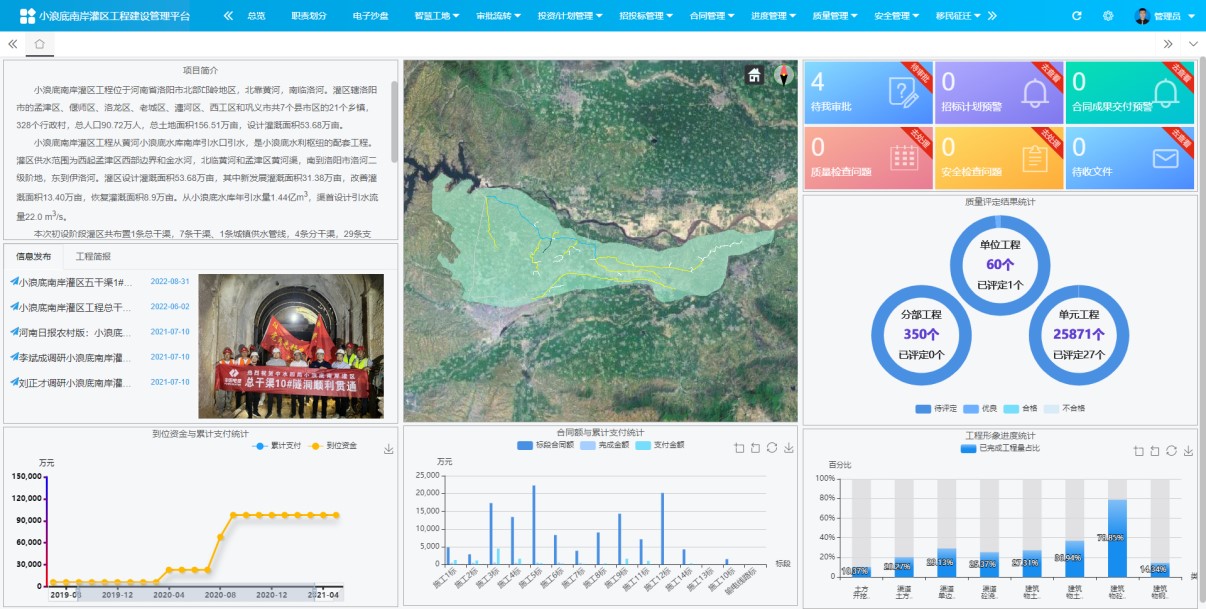 亚美体育登陆公司数字AYX爱体育院技术团队负责小浪底南岸灌区信息化设计及AYX爱体育综合管理系统研发工作,开发了基于BIM+GIS的小浪底南岸灌区AYX爱体育建筑管理平台,涵盖了AYX爱体育建筑出资、进度、质量、安全等方面,高效统筹各参建单位的工作协同,为AYX爱体育建筑管理决策提供实时、便捷、高效的信息化技术支撑。