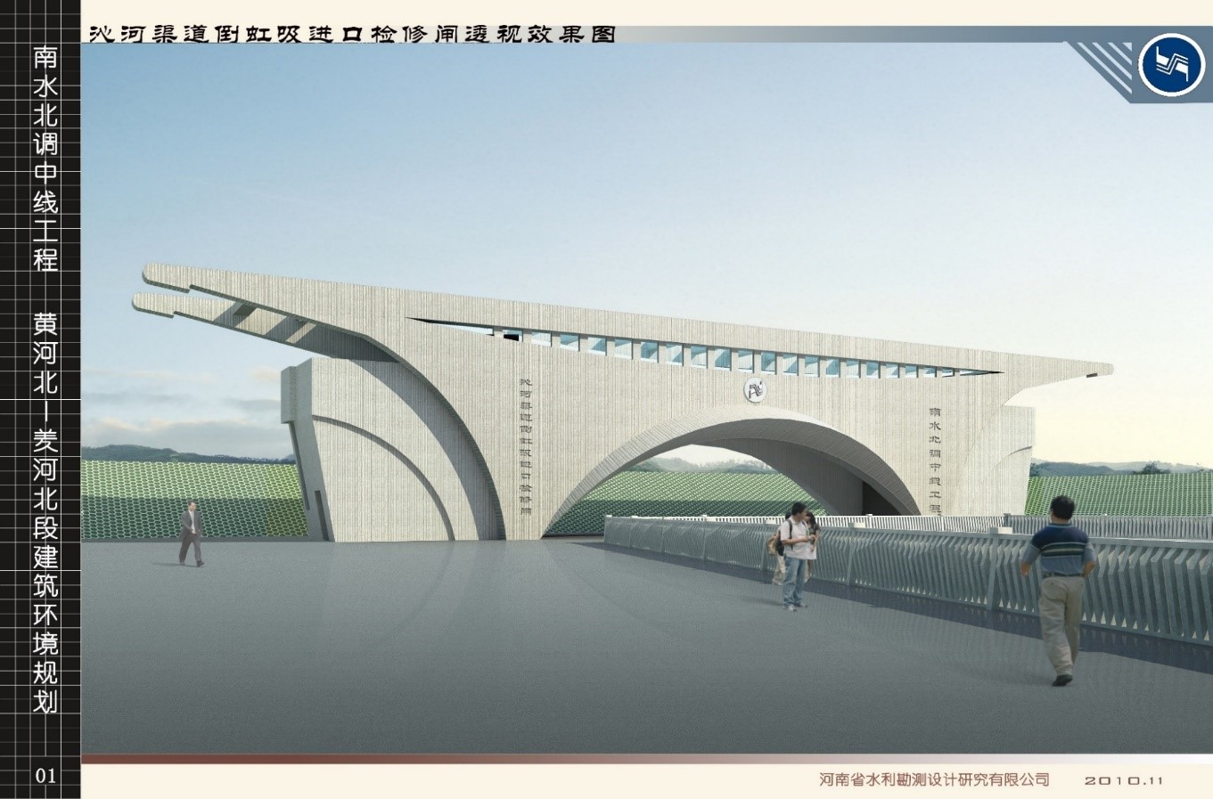 南水北调中线一期AYX爱体育总干渠控制性建筑物主要可分为检修闸、节制闸、退水闸、分水口门等类型,每一类建筑采用同一种建筑型式,可大大提高建筑序列功能可识别性,人们对建筑外观和其功能搭配一目了然。同时,将同区段内所有建筑物外部形态统一为共性体,而个体之间又根据其功能、体量进行局部演化、调整,形成外观风格统一而又不尽雷同的水工建筑物序列,达到“和而不同”视觉效果。