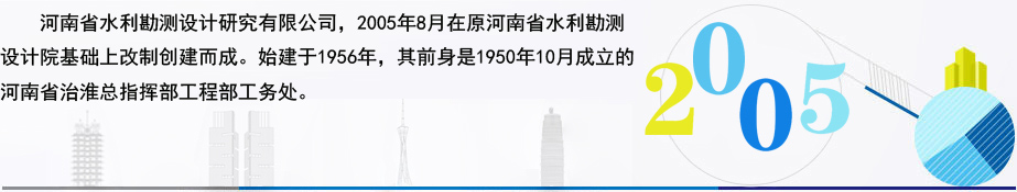公司前身为成立于1950年的河南省治淮总指挥部计划处,1956年与河南省水利厅勘测设计处合并成立了河南省水利厅勘测设计院。1980年更名为河南省水利勘测设计院,2005年经省人民政府批准,整体改制为科技型企业,并更名为亚美体育登陆。