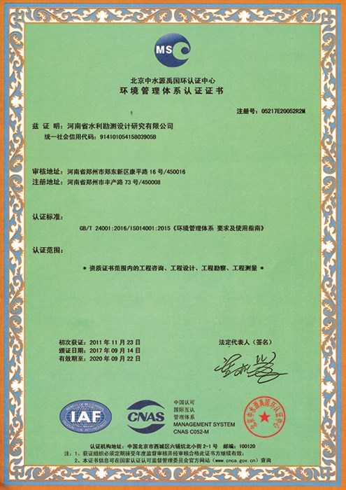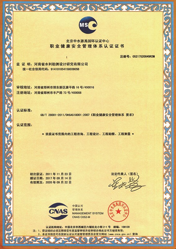 职业健康安全管理体系认证证书